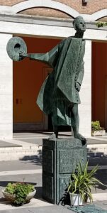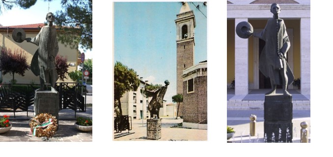 L’opera in bronzo fu ideata dal professor Angelo Biancini, maestro ceramista e scultore faentino, che accettò l’incarico a patto di poterla realizzare a suo piacimento. Secondo l’Autore rappresenta il Martire proteso in avanti a difesa dei suoi ideali, il cappello nella mano destra come scudo, la mano sinistra chiusa a pugno in atto di forza: “Uscire dalla sacrestia per andare verso il popolo”.